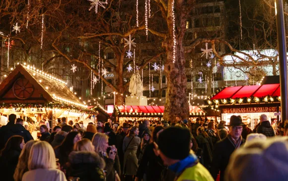 Stroll along the Thames at the Southbank Winter Market, a free outdoor market with a picture-perfect riverside setting. Wooden alpine chalets line the Queen’s Walk, selling everything from gourmet street food and bratwurst to handmade crafts and stocking fillers. The atmosphere is cosy and bustling – you can nibble Dutch pancakes and churros, then browse for unique gifts while clutching a hot mulled cider to keep warm. Open daily 11am–10pm (craft stalls close at 9pm), and closed only on Christmas Day and New Year’s Eve, this market is the perfect free London Christmas outing.